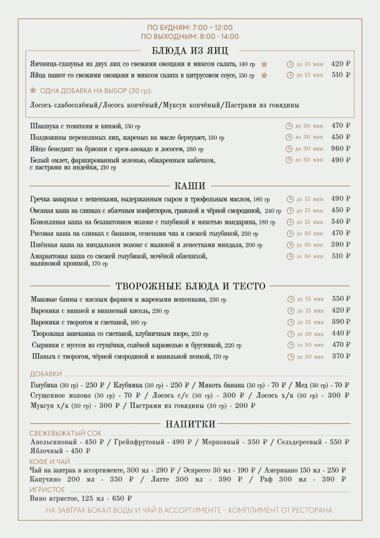 - Завтраки в выходные и праздники с 8:00 до 14:00